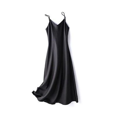 光沢感大人レディース可愛いロングVネックキャミワンピサテンマキシ丈シルクライクロングワンピースキャミワンピースフィット203050キャミワンピース無地シンプル高級感40落ち感とろみキャミソールワンピー