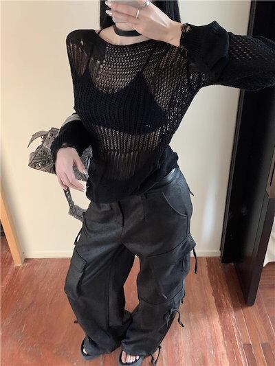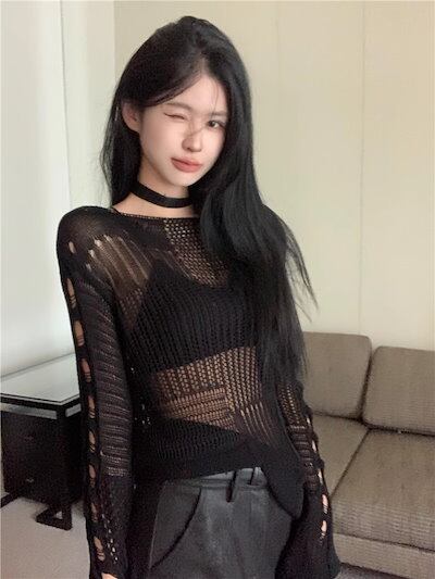 2024秋冬 長袖 ニット トップスストリート黑 ショート丈 カジュアエコルシルエットプル加工色っぽ 女っぽ カジュアル 大人っぽ 上品 サイズフェミニンゆったりカジュアル レディース透かし編み