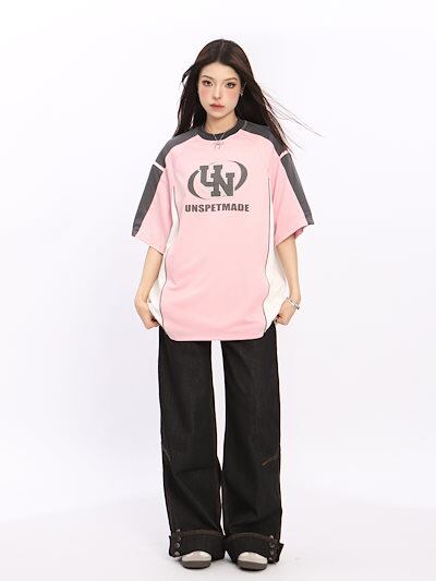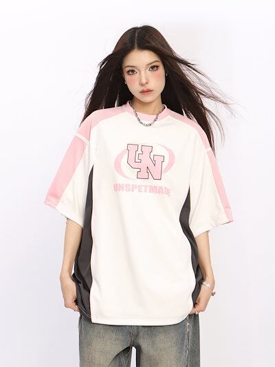 2024 秋冬 トレンド トップスバイカラー甘辛MIX半袖 かわいいTシャツレディース韓国風ロゴ衣装ルーズゆったりカジュアルおしゃれサイズスリーブシルエットファッション系サイドシャツフットスウエット春