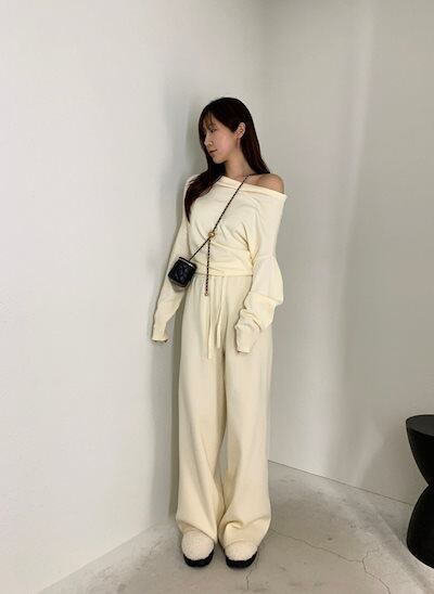 2024秋冬セットアップ トップス ニット長袖 ワンショルダー ロングパンツ ワイド ストレート ゆったり 秋 白 黒 おしゃれ かわいい 韓国ファッション レディース お出かけ