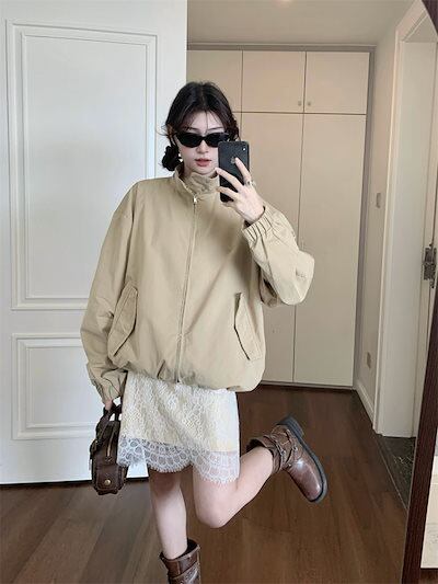 2024秋冬アウター ショートコート トレンチ ハイネック ジップ チャック 長袖 秋 ベージュ おしゃれ かわいい 韓国ファッション レディース お出かけ