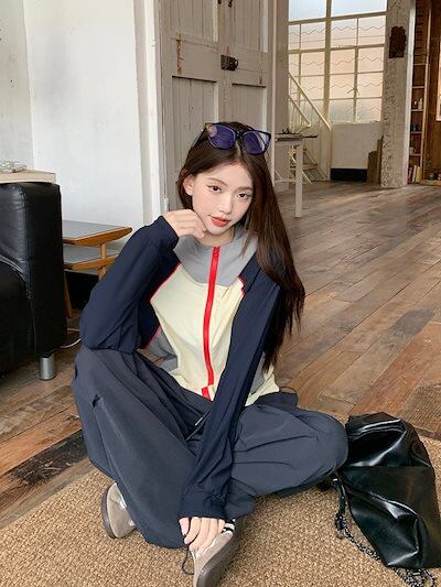 2024秋冬アウター パーカー ジップ チャック フード付き コントラスト 秋 おしゃれ かわいい 韓国ファッション レディース お出かけ