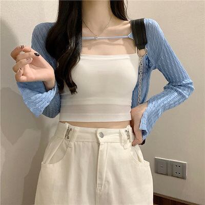 夏秋 韓国 ショート丈 薄手 カーディガン トップス 長袖 紫外線対策 UV対策 羽織り加工 きれいめ ライトニット オフィス OLネックカジュアルフレンチフェミニンファッション韓国レディース
