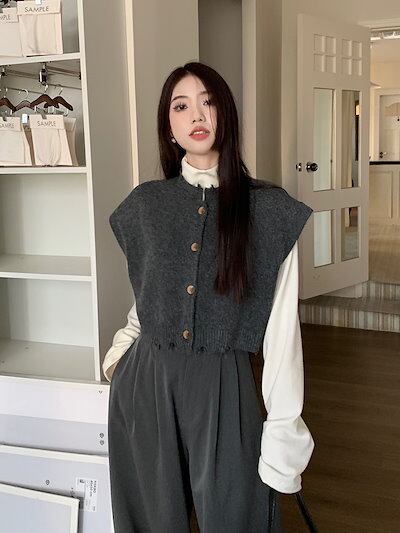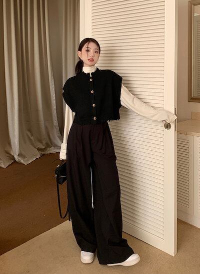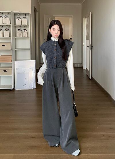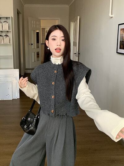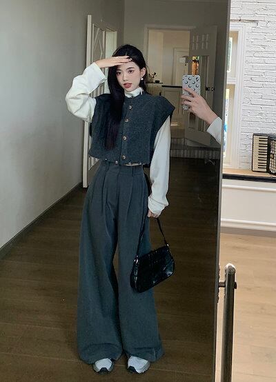 2024秋冬 重ね着風 ショート丈 レイヤード トップスニットベスト ハイネックレディース 3点セット Vネック ノースリーブ カジュアル ワイドパンツ ホワイト クール 通勤オフィスきれいめ上下
