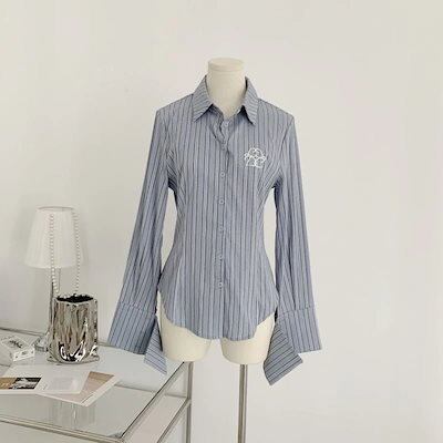 シャツ 長袖 2024 秋 新ブラウス 長袖ブルートップ刺繍ストライプシャツ