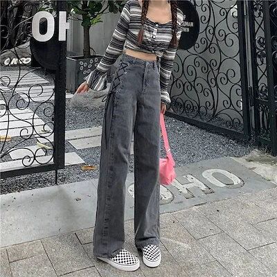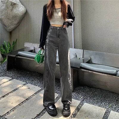 デニムワイドパンツ 秋新作 スモークグレー バンドジーンズ 着痩せ ins ゆとりがある ストレートワイドパンツ 韓国ファッション 百掛け やせて見える