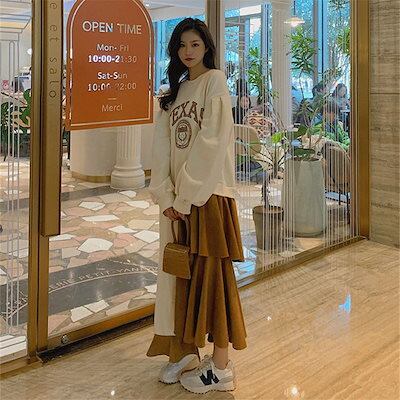 韓国ファッション 大きいサイズ パッチワーク スウェット ワンピース 長袖 ワンピース イレギュラー 着痩せ 春秋 ワンピース