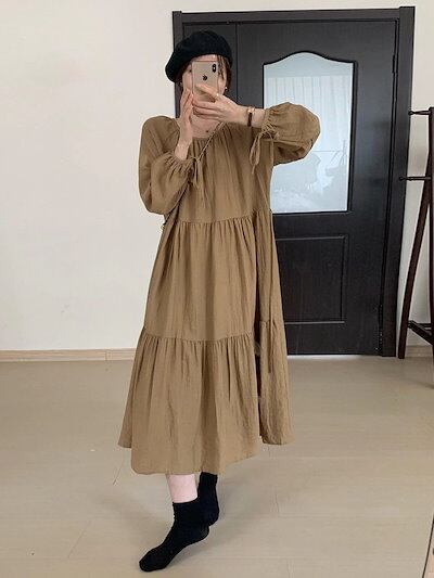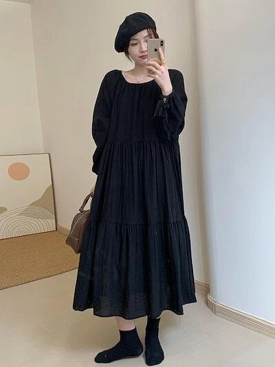 長袖ワンピース レディース 春秋 新作 韓国ファッション ゆったり 着痩せ 気質 バブル袖 ロングワンピース