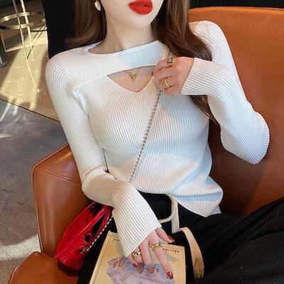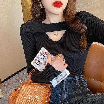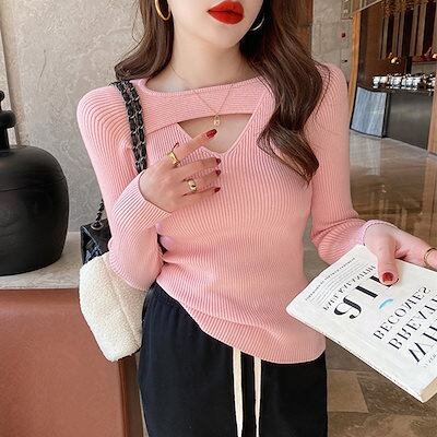 2024秋冬 トップス 長袖 ニット セーターシンプル レディース ショートおしゃれ 春穴あきカラバリカラー肌見せスタイルアップロンT色っぽ 女っぽTシャツカジュアル丈きれいめ大人ファッション