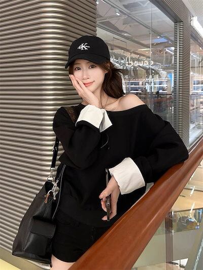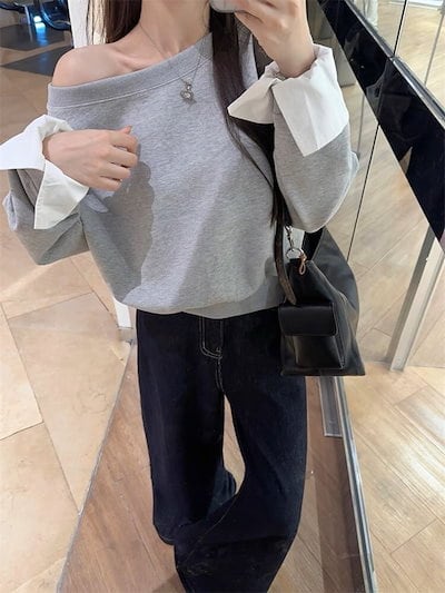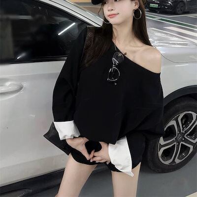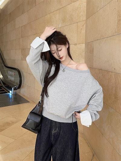 2024 秋冬トップス スウェット ワンショルダー 長袖 ショート丈 秋 おしゃれ かわいい デート シンプル 韓国ファッション レディース お出かけ