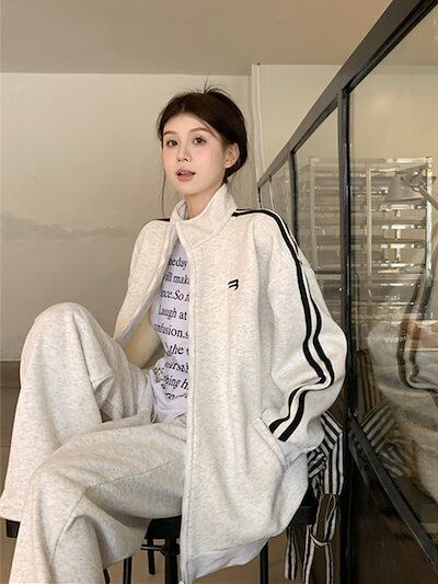 2024 秋冬 2点セット トップス ハイネック スタンドネック 羽織り ショート丈 フルパーカー ルーズ サイド上下ボトムス ストレート系冬 ゆったりサイズワイドシルエットリラックストラック