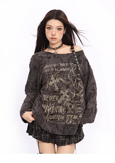 2024秋冬ワンショルダー ダメージ加工 トップス ストラップ tシャツ グラフィックプリント オーバーサイズ ロンt 長袖 韓国ファッション レディース