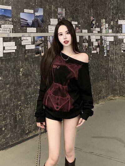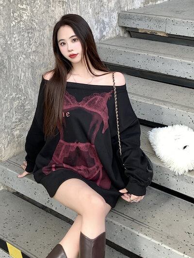 2024秋冬オフショルダー トップス セクシープリント スウェット オーバーサイズ ロンT トレーナー 長袖 韓国ファッション レディース