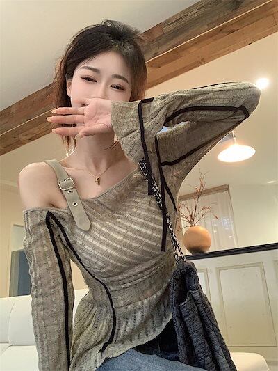 2024 秋冬 韓国 女度を格上げ tシャツ ファッション トップス 韓国系 長袖 ショート薄手フィット プリント レイヤード 重ね着 肌見せ 女っぽハイフレンチ タイト丈 レディース T