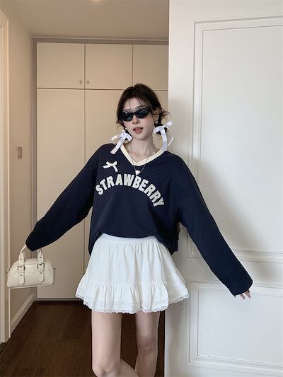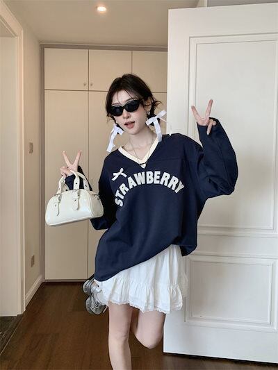 2024 秋冬トレンド トップス Vネック長袖かわいいバイカラーTシャツレディース韓国風衣装ルーズゆったりカジュアルおしゃれサイズスリーブシルエットファッション系サイドシャツフットバイカラーニュートロ