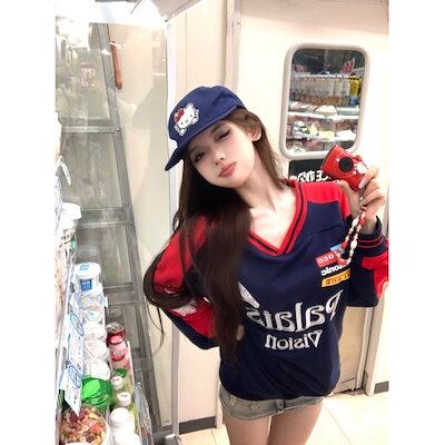 2024 秋冬 トレンドVネック トップスバイカラー長袖 かわいいK-POPTロング白レディース韓国風ロゴ衣装ルーズゆったりカジュアルおしゃれサイズスリーブシルエットファッション系サイドシャツフット春