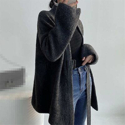 カーディガン レディース 秋冬 ニット チュニック 厚手 羽織り セーター アウター ゆったり ボリューム 防寒 長袖 トップス ローゲージニット ベルト ケーブル編み おしゃれ カジュアル 暖かい
