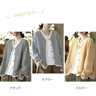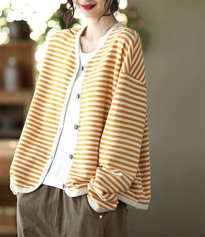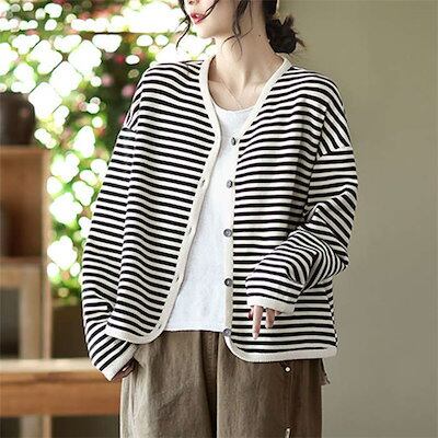 カーディガン レディース ニットカーディガン トップス ボーダー柄 春 秋 ライトアウター Vネック 羽織り カーデ 柔らかい オールシーズン 前開き アウター コットン ショート丈 ゆったり カジュ