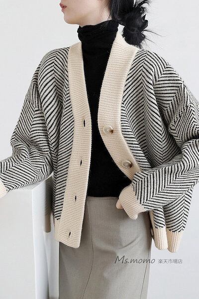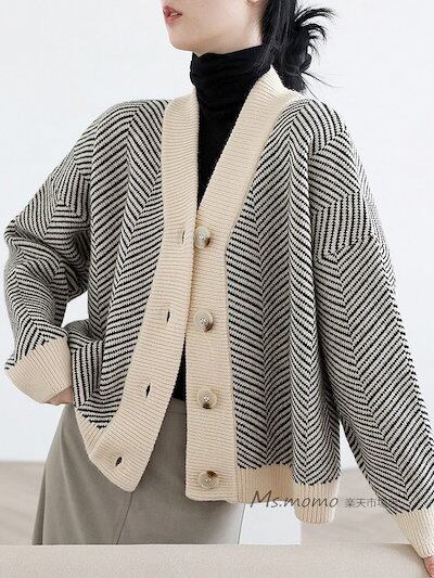 秋冬 ボーダー柄コーディガン 50.代 40代 ニットトップス ニットカーディガン アウター ゆったり おしゃれ 韓国風 長袖 30代 vネックカーディガンショット丈セーター レディース
