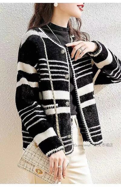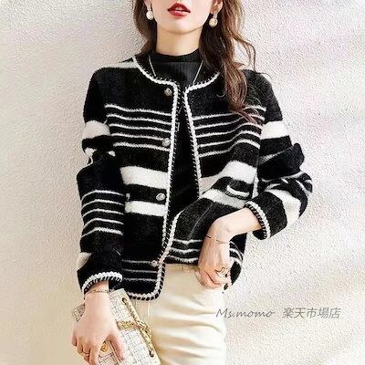 フェイクミンクカーディガン 50代 秋冬 ショット丈アウター おしゃれ ゆったり 卒業式 入学式 大人 30代 結婚式 韓国風 長袖ノーカラージャケット レディース 秋服 40代 通勤OL 配色ボーダ