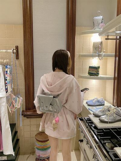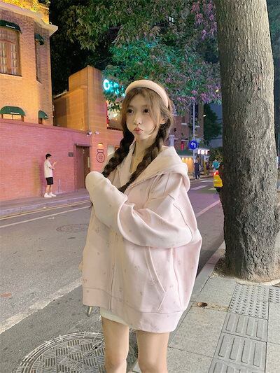 2024 秋冬トップス パーカー フード付き ジップ チャック 長袖 花柄 ポケット 大きめサイズ ゆったり 細見え 秋 水色 おしゃれ かわいい ガーリー キュート 甘め 韓国ファッション レディー