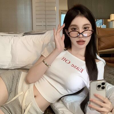 2024 春夏 甘い トップス Tシャツ ラウンドネック丈 休日 フレンチ プリント 韓国 ブラウス ファッション系 タイト スリムフィット丈短め半袖 ショートレディースへそ出し休日おしゃれT