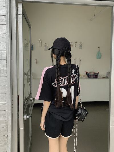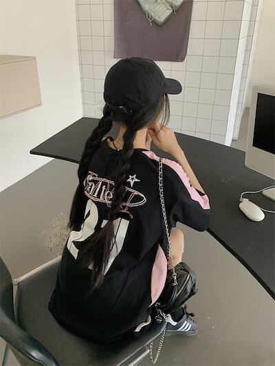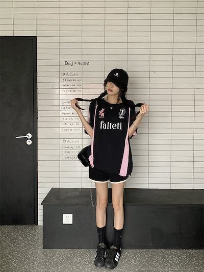 2024 夏 韓国 甘い 可愛い風トップス Tシャツ ファッション系半袖スリムフィットサイドペイントシルエットゆったり丈 休日レディースサイズ韓国Vネック おしゃれカジュアルメンズライク T