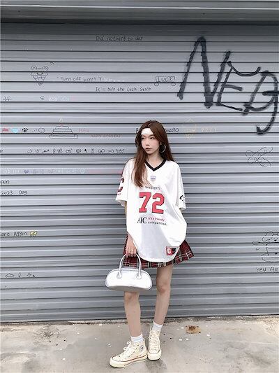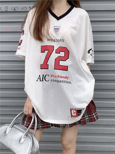 2024 夏 韓国可愛い風トップス Tシャツ ファッション系 半袖 スリムフィット サイド ペイントシルエットゆったり丈 休日レディースサイズ韓国Vネック おしゃれ カジュアル メンズライク T