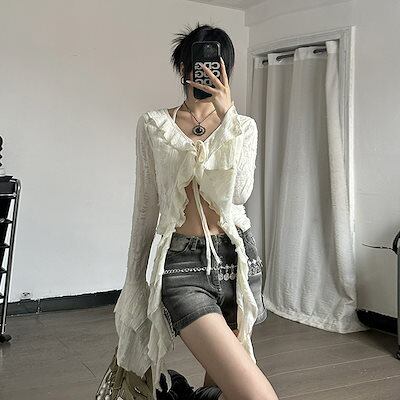 2024 夏秋 韓国 ショート丈 変形 カーディガンブラウストップスレディース長袖へそ出し UVカット 羽織り きれいめライトニットOLネックカジュアルフレンチフェミニンファッションフィッシュ系