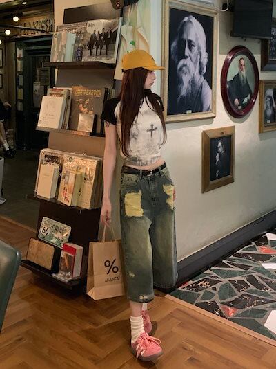 2024春夏パンツ デニム ジーンズ 7分丈 ダメージ加工 ウォッシュ加工 ワイド ハイウエスト 美脚効果 脚長効果 細見え 夏 おしゃれ かわいい 韓国ファッション レディース お出かけ