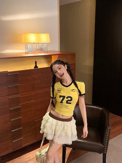 2024 春夏トップス プリント半袖 Tシャツ 韓国 ラウンドネックロゴスリム 可愛い風へそ出し ショート おしゃれスリーブ カジュアルサイドコーデ丈 ファッション系レディースストリートお出かけ T