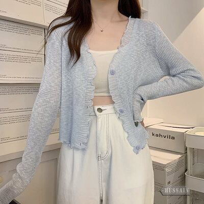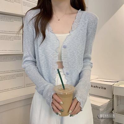 2024 夏 韓国 ライトニット カーディガン トップス 羽織り加工 ショート 薄手 長袖 紫外線対策 UV対策 きれいめ オフィス OLネックカジュアルフレンチフェミニンファッション韓国 レディース