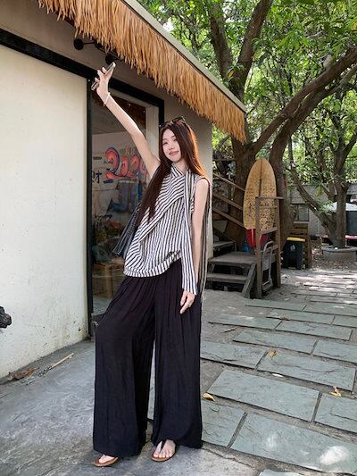 2024夏トップス シャツ ハイネック ストライプ ノースリーブ ゆったり 細見え 夏 黒 ブラック おしゃれ かわいい 大人っぽい 韓国ファッション レディース お出かけ
