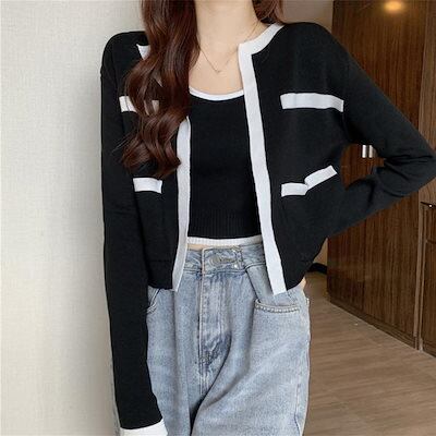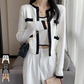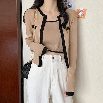 韓国ファッション レディース ニットカーディガンセット コントラストカラーニットセーター