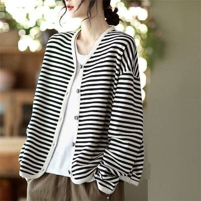 カーディガン レディース ニットカーディガン トップス ボーダー柄 春 秋 ライトアウター Vネック 羽織り カーデ 柔らかい オールシーズン 前開き アウター コットン ショート丈 ゆったり カジュ
