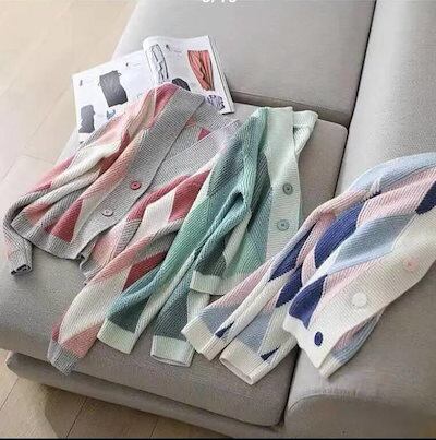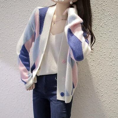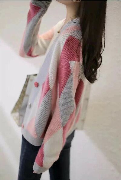 春 ネック 冬 大きいサイズ 長袖 トップス 秋 カットソー オフィス カジュアル 配色 几何柄 ゆったり カーディガン 黒 厚手 アウター ニット レディース