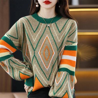 プレゼント韓国風 ニットソー ゆったり 大人可愛い ニットセーター セータートップス 幾何柄 長袖 レディース秋冬 着痩せ 配色 ニット ニットセーター