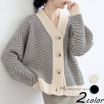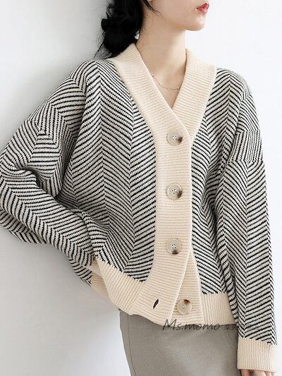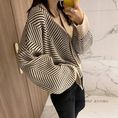 秋冬 ボーダー柄コーディガン 50.代 40代 ニットトップス ニットカーディガン アウター ゆったり おしゃれ 韓国風 長袖 30代 vネックカーディガンショット丈セーター レディース