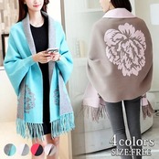 羽織り カーディガン 袖付ポンチョカーデ ストール ニット ニットカーディガン レディース 大花柄 フリンジ レディース バイカラー 大判 あたたか ポンチョ セーターレディース