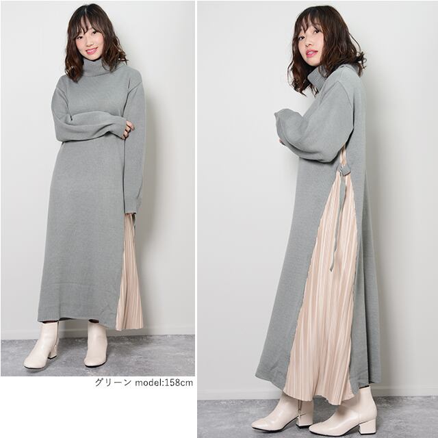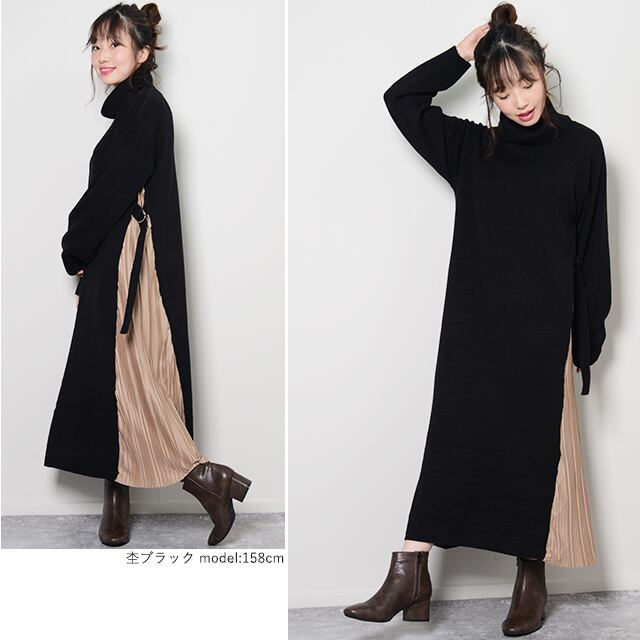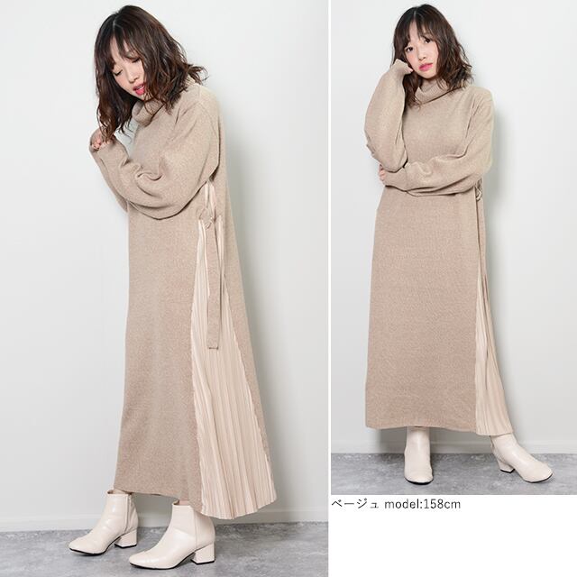 バルキーサイドプリーツワンピース 【即納】 ニットワンピ タートル ロング シンプル 上品 大人