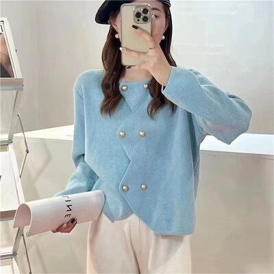 秋冬の新作ゆるふわ ベーシックニット ニットカーディガン レディース コートニッチデザイン 不規則なデザイン感 ダブルブレストセータートップス