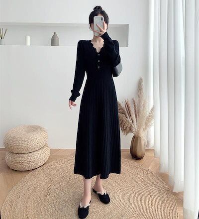 レディース ニット タートルネック ニットニットワンピース 秋冬 ロング 膝丈 韓国ファッション レディース ニット カーキ A-C98