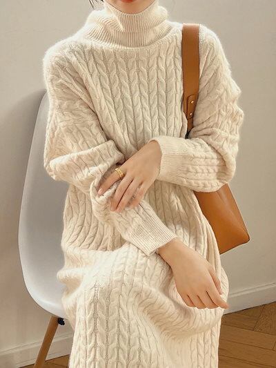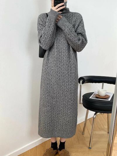 秋冬ファッション ニットワンピース レディース 長袖 丈 ワンピ フェミニン おしゃれ きれいめ ケーブル編み あったか エレガント ニット ロングセーター 韓国ドレス