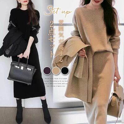 オフェスニットセットアップ 韓国 スカート セーター きれいめ 長袖 レディース 秋冬ニットスカート セットアップ ロング丈 2点セット オフェス ニットセット スカート ニットスカート セーター 無地 エレ