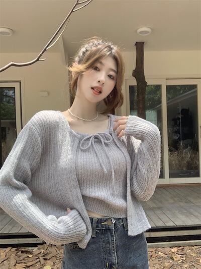 2024 秋冬かわいい人気 トップス 長袖 ニット無地レディースショート 羽織りファッション系 ルーズ ネック女っぽカジュアルボレロゆったり 大人っぽ春セーターフレンチ型 2点