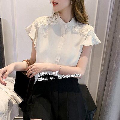 半袖ブラウス 無地 シフォンシャツ トップス フリル袖 レース 切り替え きれいめ 夏秋物 レディース 気質 着痩せ 韓国風 お出かけ デート 食事会 二次会
