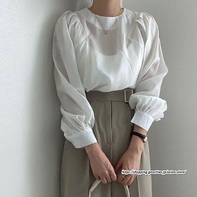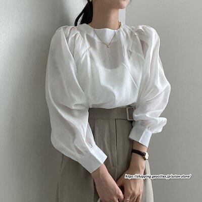 新入庫 パフスリーブブラウス レディーストップスシャツ 長袖 春夏服 透け感 丸首 フリル プルオーバー 長袖ブラウス シャツブラウス オフィス 大人 卒業式 入学式 20代