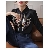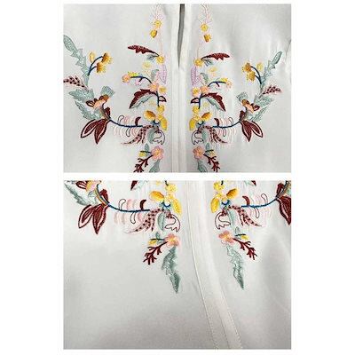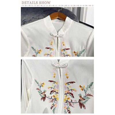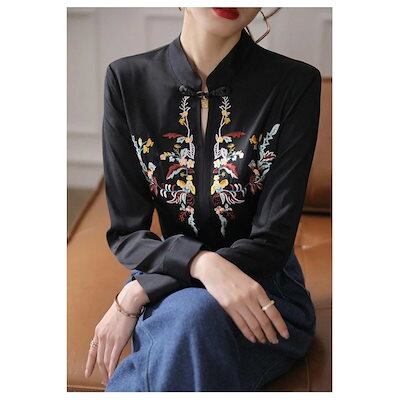 刺繍 ブラウス チャイナボタン 春 秋 長袖 マオカラー 上品 エレガント 立ち襟 シャツ レディース スタンドカラー きれいめ トップス 白 黒 お