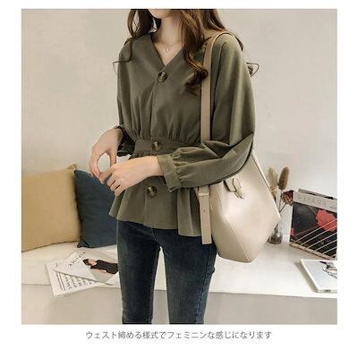 長袖ブラウス レディース 綿混 ブラウス Vネック 鎖骨見せ 大人 エレガント ナチュラル 上品 普段着 お洒落 フレアブラス ウェスト締める