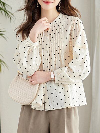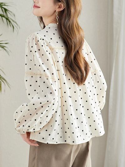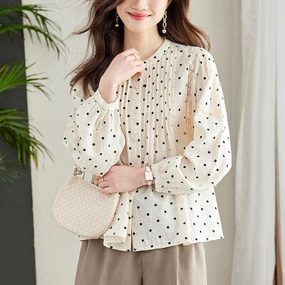 今っぽシアーシャツ 長袖 韓国ファッション 春のコットンシャツ 通勤ゆったりクルーネックドットトップス ブラウス レディース シャツ